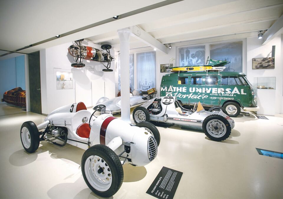 Weitere besondere Exponate der Ausstellung sind: Ein VW Käfer mit Brezelheckscheibe, ein Exemplar aus der allerersten Baureihe dieses Modells, der nach dem 2.Weltkrieg aus Metallschrott aufgebaute Petermax Müller Weltrekordwagen und der NSU Kompressor, der so konzipiert wurde, dass er ausschließlich geradeaus fahren konnte, um auf gerader Rennstrecke Rekordzeiten zu erzielen.