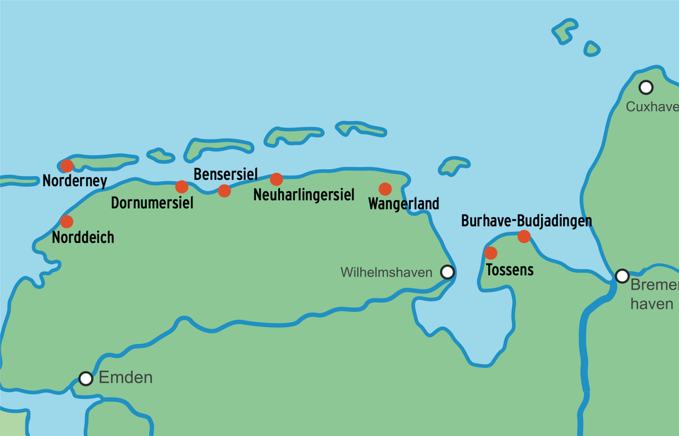 Quasi genau gegenüber, aber eben wieder auf dem Festland, liegt Norddeich. Speziel für Familien gibt es Wattführungen und einen Familienpass. Bei schlechtem Wetter gibt es ein großes Kinderspielhaus mit drei Ebenen für Klettergeräte und Spiele.