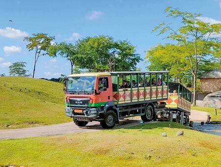 Eine Rundfahrt durch die freie Wildnis der Tiere mittels eines »Safarizugs«, angetrieben von einem MAN Lkw, der zwei mehr oder weniger geräumige offene Waggons zieht. Hier finden pro Fahrt ca. 70 Passagiere Platz, die dann im Schleichtempo an Giraffen, Zebras, Nashörnern, Kamelen und Dromedaren vorbeischaukeln. In Ferienzeiten oder an Feiertagen muss man sich hier auf längere Warteschlangen einrichten. Wem das Tempo hier nicht ausreicht, kann anschließend in die benachbarte Achterbahn umsteigen, die den Adrenalinspiegel wieder nach oben katapultiert. Besonders erwähnt werden dürfen an dieser Stelle mehrere ausrangierte Eisenbahnwaggons, die scheinbar nutzlos im Gehege abgestellt worden sind. Man kann auf dem Rundweg durch diese hindurchlaufen und erlebt mit etwas Glück beim Blick durch die Scheiben die Kamele greifbar nahe.